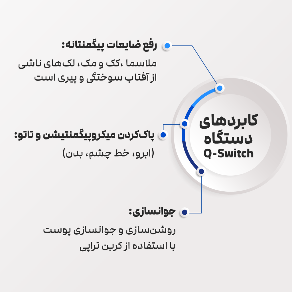 انتخاب متخصصان پوست و زیبایی برای درمانهای مؤثر و بدون آسیب. دستگاه کیوسوئیچ از سودآورترین و پرکاربرد ترین دستگاهها میباشد که با تولید پالسهای پر انرژی و بسیار کوتاه و نیز دقت بالایی که دارد بر رنگدانهها، لکها و جوهر تاتو اثر میکند بدون آنکه آسیب بزند به بافت های سالم پوست و از نتایج آن داشتن پوستی شفافتر، یکنواختتر و بدون رنگدانههای ناخواسته میباشد.